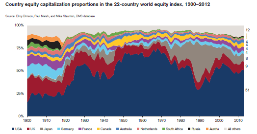 Речь идет о распределении по регионам инвестирования в соответствии с рыночной капитализацией всего фондового рынка страны. На рисунке мы можем увидеть в каких пропорциях изменялась капитализация крупнейших стран на временном промежутке с 1900 г. по 2012 г.