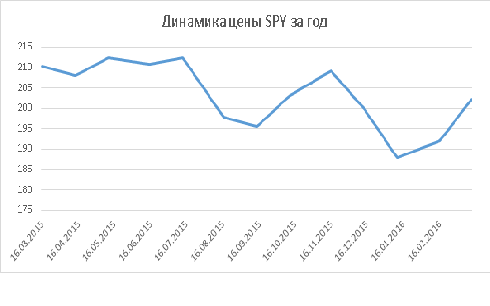 С 16.03.2015 по 14.03.2016 цена SPY снизилась с 210,41 до 202,17 доллара за один пай или на 4%. Такой же убыток понесли те, кто инвестировал в индекс S&P 500 единовременно год назад.